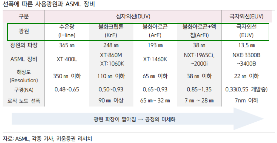 상기 도표는 네덜란드의 반도체 장비 제조사인 ASML과 그 사용 광원을 정리한 내용입니다.