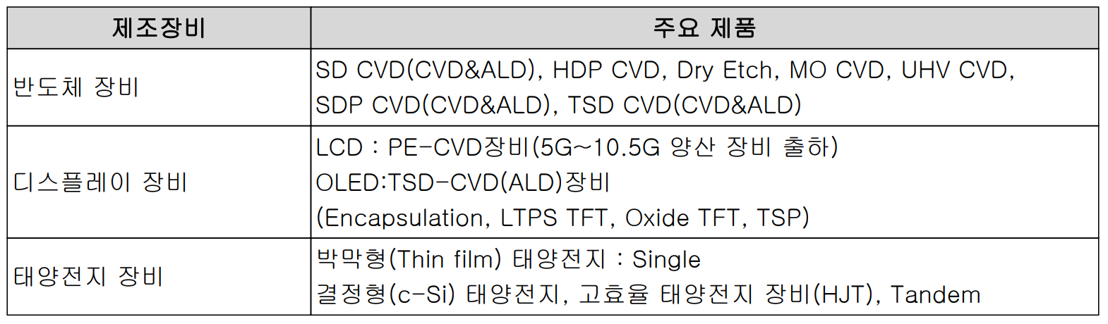 최근에는 반도체 제조용 장비 및 OLED 디스플레이 제작용 장비와 태양전지 제조용 장비 분야에 집중하고 있습니다.
