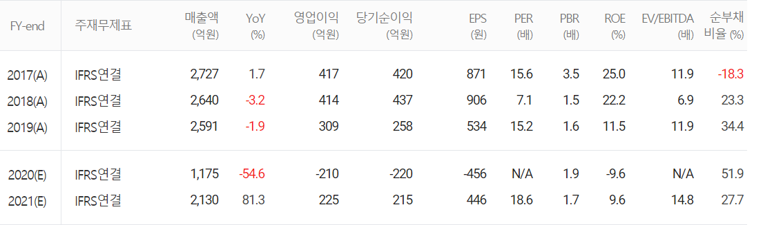 최근 3개월간 증권사에서 발표한 전망치를 보면, 당사는 2020년 매출 1175억, 영업이익 -210억 원을 기록할 것으로 내다봤습니다. 2021년의 경우 올해의 저조한 실적에서 회복하여 매출액 2130억, 영업이익 225억 원을 달성할 것으로 전망했습니다.