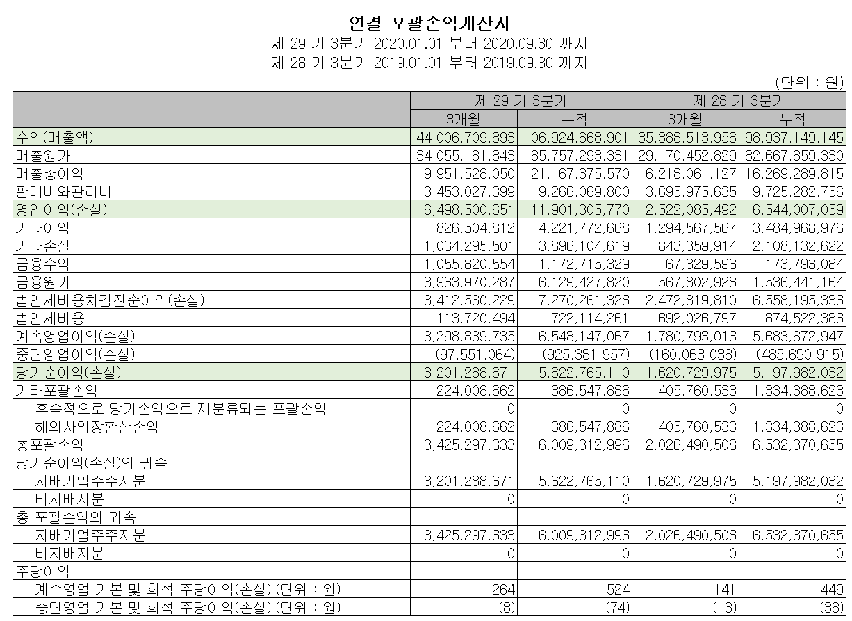 2020년 3분기 매출액은 440억 원, 영업이익은 64.9억 원을 기록하면서 전년 동기 대비 각각 24.3%, 157% 증가했습니다. 당사는 자동차 부품, 생산, 판매 사업부문을 중단하기로 결정해서 지난 3분기 말에 해당 사업과 관련된 자산과 부채는 매각 예정으로 관련된 영업에 대한 손익은 중단 영업으로 표시하여 결산한다고 밝혔습니다. 따라서 영업이익 대비 당기순이익률이 높지는 않습니다.