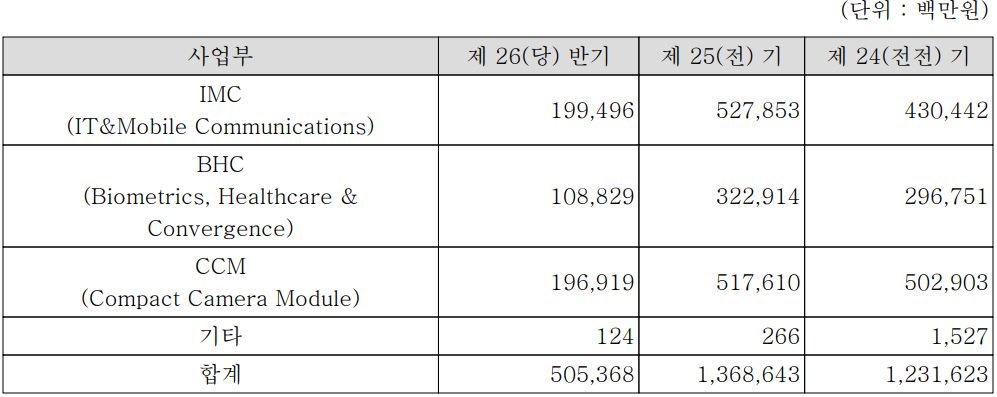 당사와 종속회사의 사업부문은 스마트폰, 스마트 워치 등 IT 기기에 사용되는 각종 PBA 모듈을 개발 및 공급하는 IMC 사업부문, 생체인식 모듈과 전통적 제품에 IT기술을 접목한 컨버전스 제품, 부품, 모듈을 개발 및 공급하는 BHC(바이오 헬스케어) 사업부문 그리고 스마트폰에 적용되는 카메라 모듈을 개발 및 공급하는 CCM 사업부문으로 구성되어 있습니다. 또한 2019년부터 통신장비 업체인 쏠리드와 협력을 통해 Indoor Radio Unit를 개발, 공급 중에 있으며, 미국 믹스컴과 업무협약을 통해 5G 안테나 모듈을 공급하면서 사업 영역을 확장하고 있습니다.