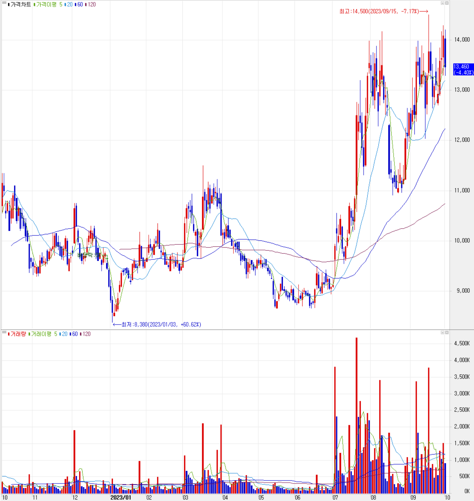 10월 4일 장 종료 기준 당사의 주가는 전 거래일보다 4.4% 내린 13,460원에 거래를 마쳤습니다. 외국인 비중은 21.23%이며, 시가총액 8,941억 원으로 코스피 시총 기준 228위 종목입니다.