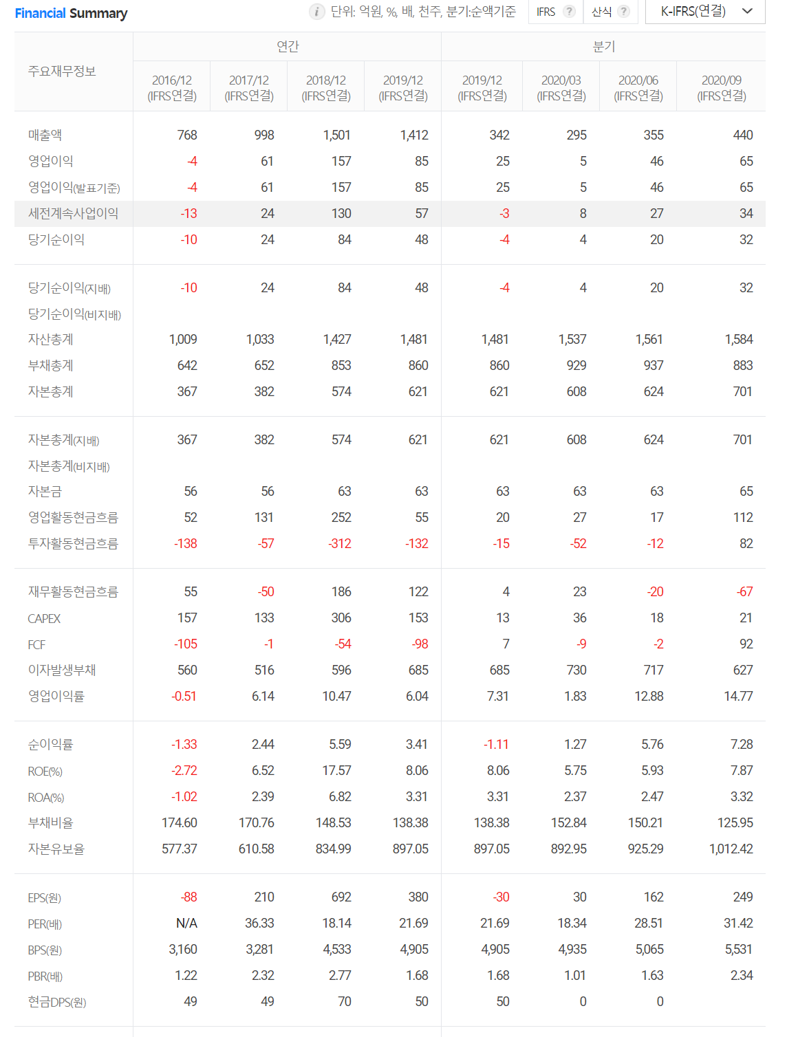 지난 3분기 코로나19로 인한 경제적 어려움을 극복하면서 2,3 분기 들어 매출, 영업이익 모두 개선되는 모습입니다. 부채비율도 점점 개선되어 가는 모습으로 재무 흐름이 대체로 안정적입니다. 3분기에는 거의 모든 부문이 개선되면서 알짜 기업이라는 생각이 드네요.