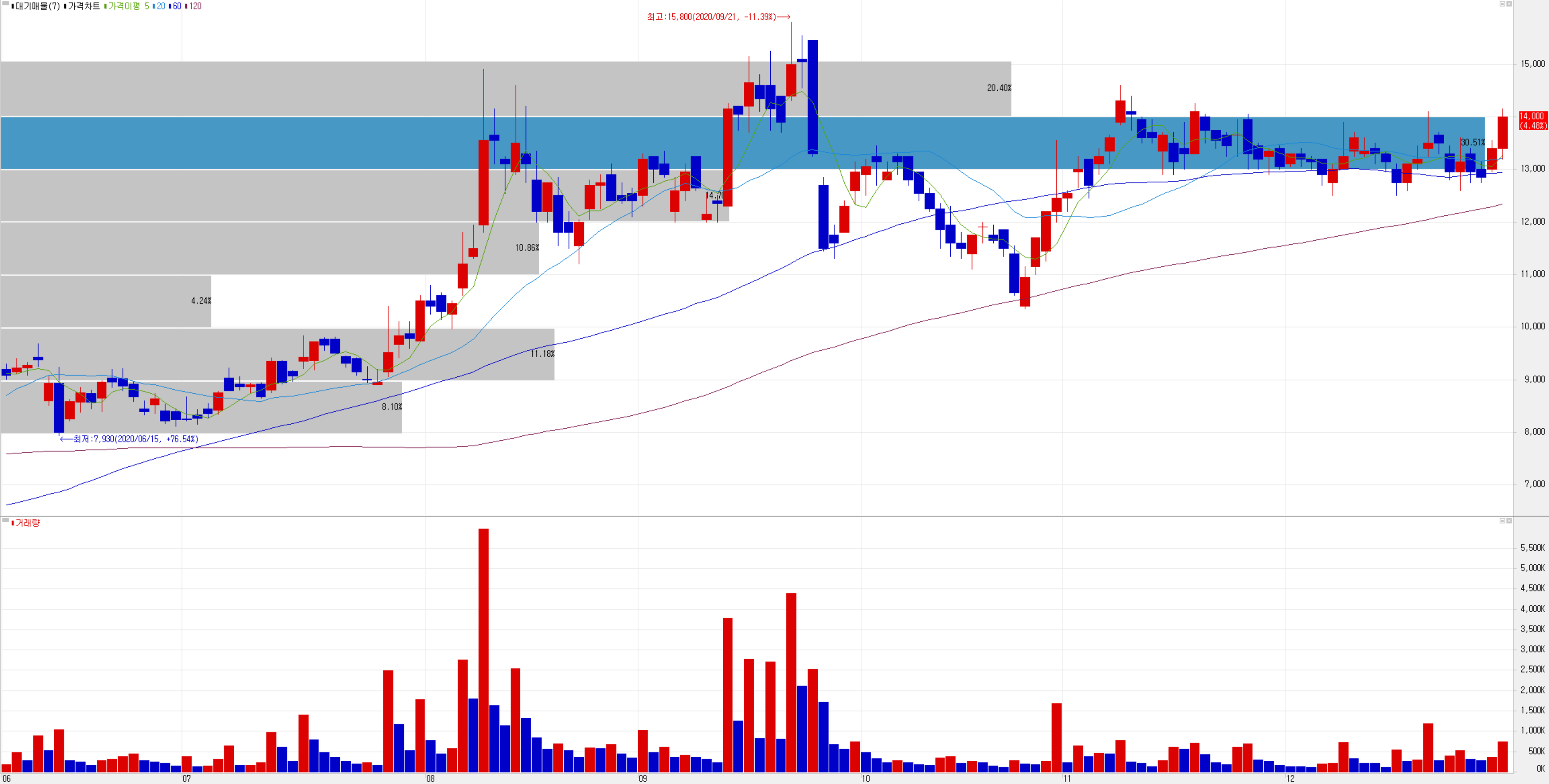 11월 초부터 거의 두 달간 박스권에서 횡보하다가 29일에는 60일선을 터치하고 상승했고, 마지막 장날인 30일에는 5일선을 찍고 올랐습니다. 최근 들어서 기관과 개인의 매수세가 유입되었고, 기관 매물이 나왔습니다. 12월 마지막을 기념하면서 오늘 소액으로 저점 매수했는데 13,200원 에 손절 예상하지만 희망찬 2021년을 기대해 봅니다.