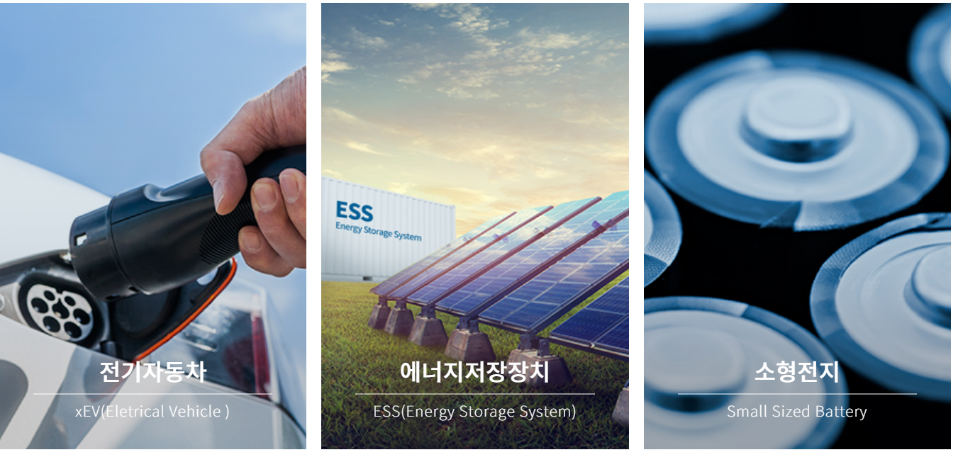 당사의 주요 제품에는 전기자동차(xEV) 및 에너지저장장치(ESS)용 중대형 부품, 전동공구, 노트북 및 가전제품 등에 사용하는 소형 원형 전지 부품 그리고 휴대폰 등에 사용되는 소형 각형 전지 부품 분야가 있습니다.