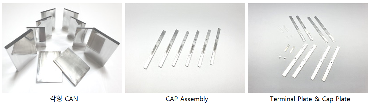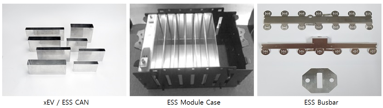2차전지의 중대형 부품에는 전기자동차용 CAN과 에너지저장장치용 모듈 케이스 및 부스바가 있습니다.