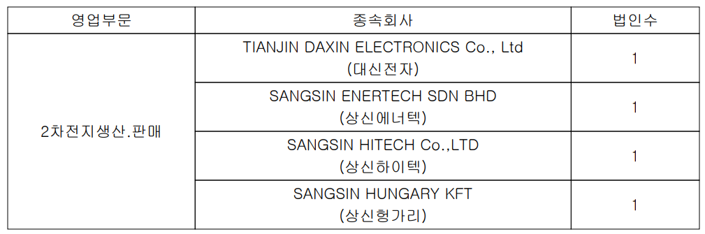 상신이디피는 총 4개의 종속회사가 있으며 모두 2차전지 관련 생산, 판매 영업 부문 등의 사업을 합니다.