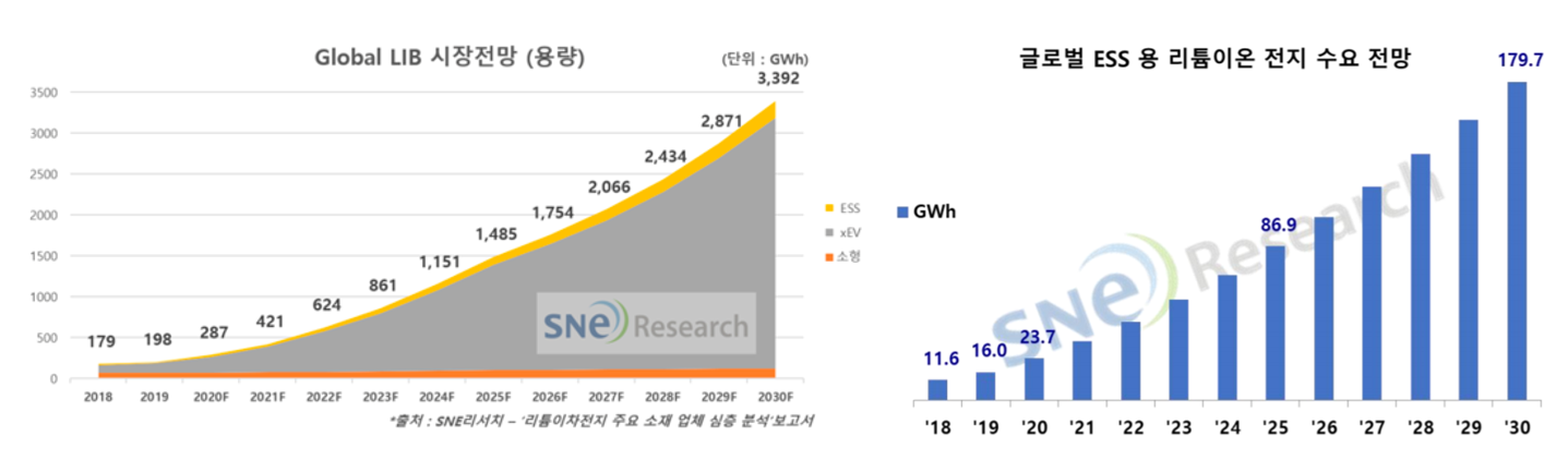 시장조사 전문기관인 SNE리서치에 따르면, 2차전지의 성장성은 전기자동차의 성장에 비례해 2025년까지 매년 28%의 성장을 예상하고 있습니다. 배터리 용량으로 볼 때 2025년에는 2020년 대비 5배가 넘는 성장을 할 것으로 예상하고 있습니다. 신재생에너지의 발전으로 인한 에너지저장장치의 수요 확대도 예상됨에 따라 당사의 ESS용 부품에 대한 성장도 기대가 됩니다.