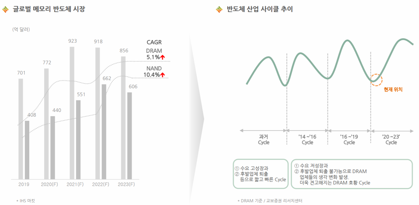 | 삼성전자 | 1. 2020년 평택 공장 완공 - DRAM, NAND 등의 메모리 생산설비에 대한 투자 진행 중 2. 중국 시안(SCS) 공장 2019년 이후 2021년까지 단계적 투자 진행 3. 기타 5G, AI, IOT등 Big Data Storage 수요로 인한 3D NAND 수요 증가 예상 |