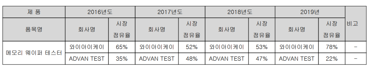 글로벌 반도체 테스트 장비 시장은 어드반테스트와 테러다인이 약 70~80%의 점유율을 보이고 있으며, 와이아이케이의 경우 메모리 웨이퍼 테스터 장비의 국내 시장 점유율은 45~50% 정도입니다.