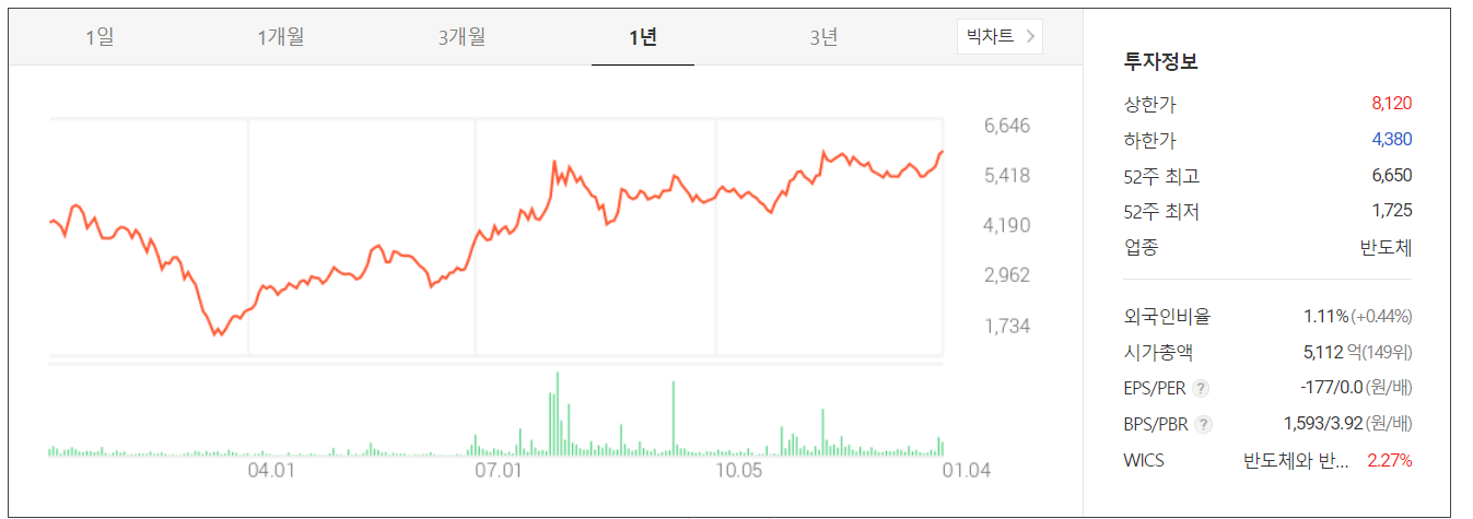 2021년 새해 첫 거래일인 1월 4일은 1.28% 오른 6,330원에 마감했습니다. 전반적인 반도체 장비 관련주 평균 정도 상승한 것 같습니다. 중소형 반도체 주답게 수급에서는 개인이 활발한 것 같습니다.