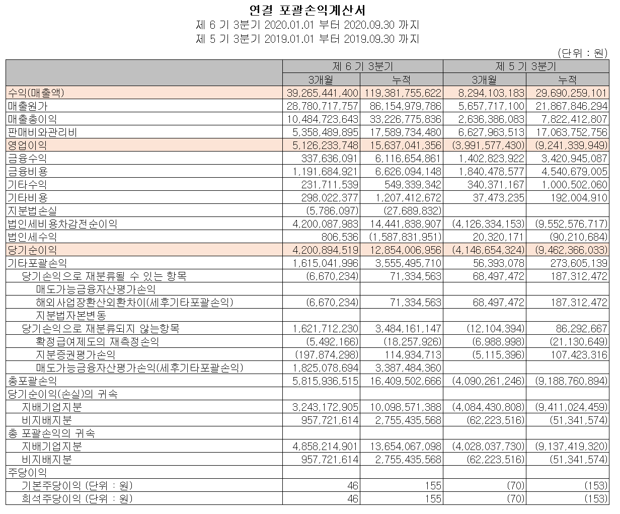 전자공시에 의한 당사의 연결 기준 3분기 매출액은 392.6억 원으로 전년 동기 대비 373.6% 증가했고, 영업이익은 51.2억 원을 기록하면서 반도체 산업이 침체해 있던 전년 동기 대비 흑자 전환했습니다.