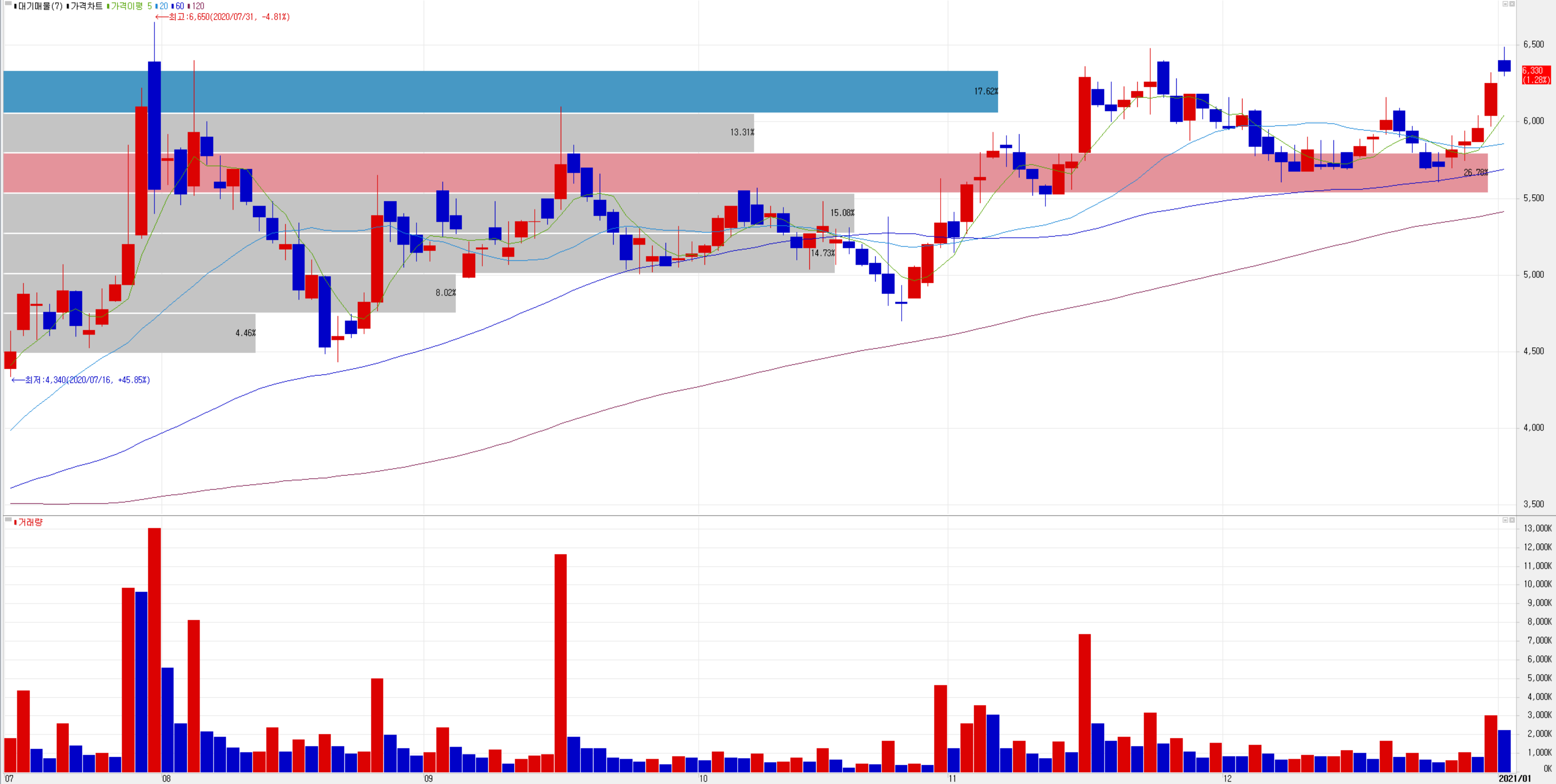 6천 원 대 초반에 대기매물이 많아서 크게 올리지 못하고 내려왔네요.