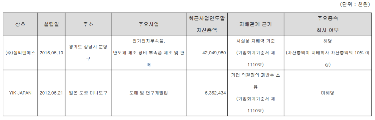 계열회사로는 메모리 테스트용 Probe Card, 세라믹 기판 등을 제조, 공급하는 (주)샘씨엔에스와 도매 및 연구개발을 위주로 하는 일본 YIK JAPAN 이 있습니다.