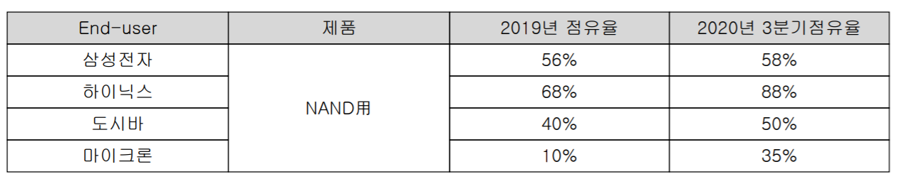 당사는 주 고객사인 삼성전자와 공동개발 등 오랜 협력을 기반으로 점차 고객사의 점유율을 높여가고 있으며 2019년의 경우 점유율 78%을 달성하면서 완벽한 우위를 점하고 있습니다.