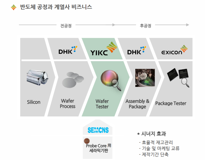 당사는 또한 반도체 전공정 장비 기업인 디에이치케이솔루션(주)과 반도체 패키지 검사장비 업체인 (주)엑시콘과 특수관계인으로서 계열사를 통한 반도체의 모든 공정에 대해 시너지를 기대할 수 있는 기업입니다.