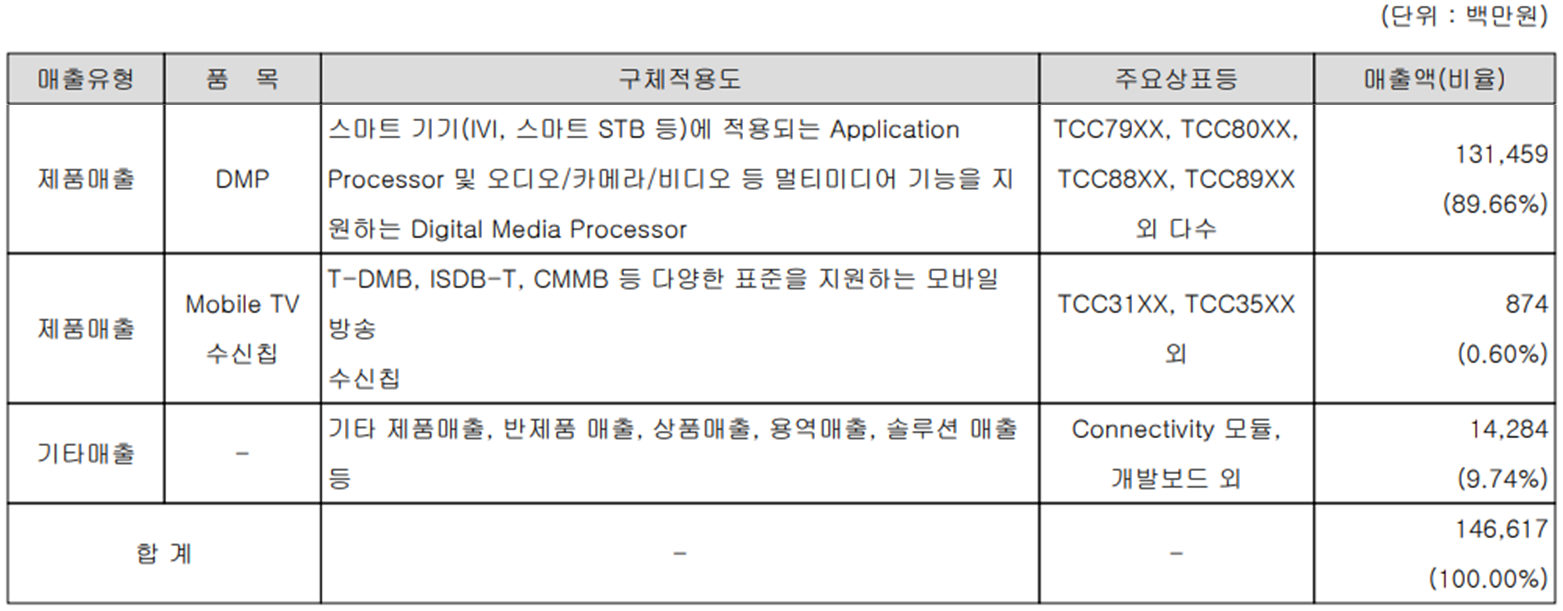 당사는 반도체 시장의 응용 제품 중 주요 기능의 핵심 제어(mcu), 멀티미디어(DMP), 그래픽, Connectivity 및 사용자 인터페이스 등의 메인 기능을 담당하는 AP(Application Processor), 각종 모바일 방송 표준을 지원하는 모바일 TV 수신 칩 그리고 블루투스, Wifi, GPS 등 셋톱박스 및 자동차 전장용 Connectivity 모듈을 개발, 공급하고 있습니다.