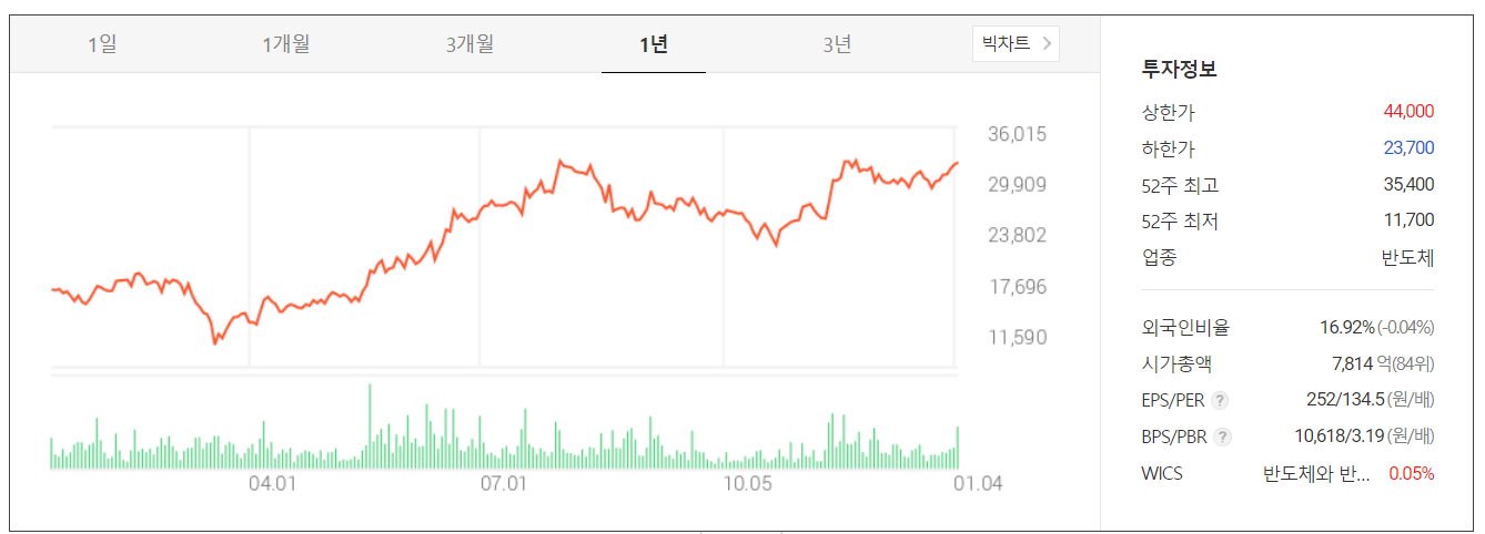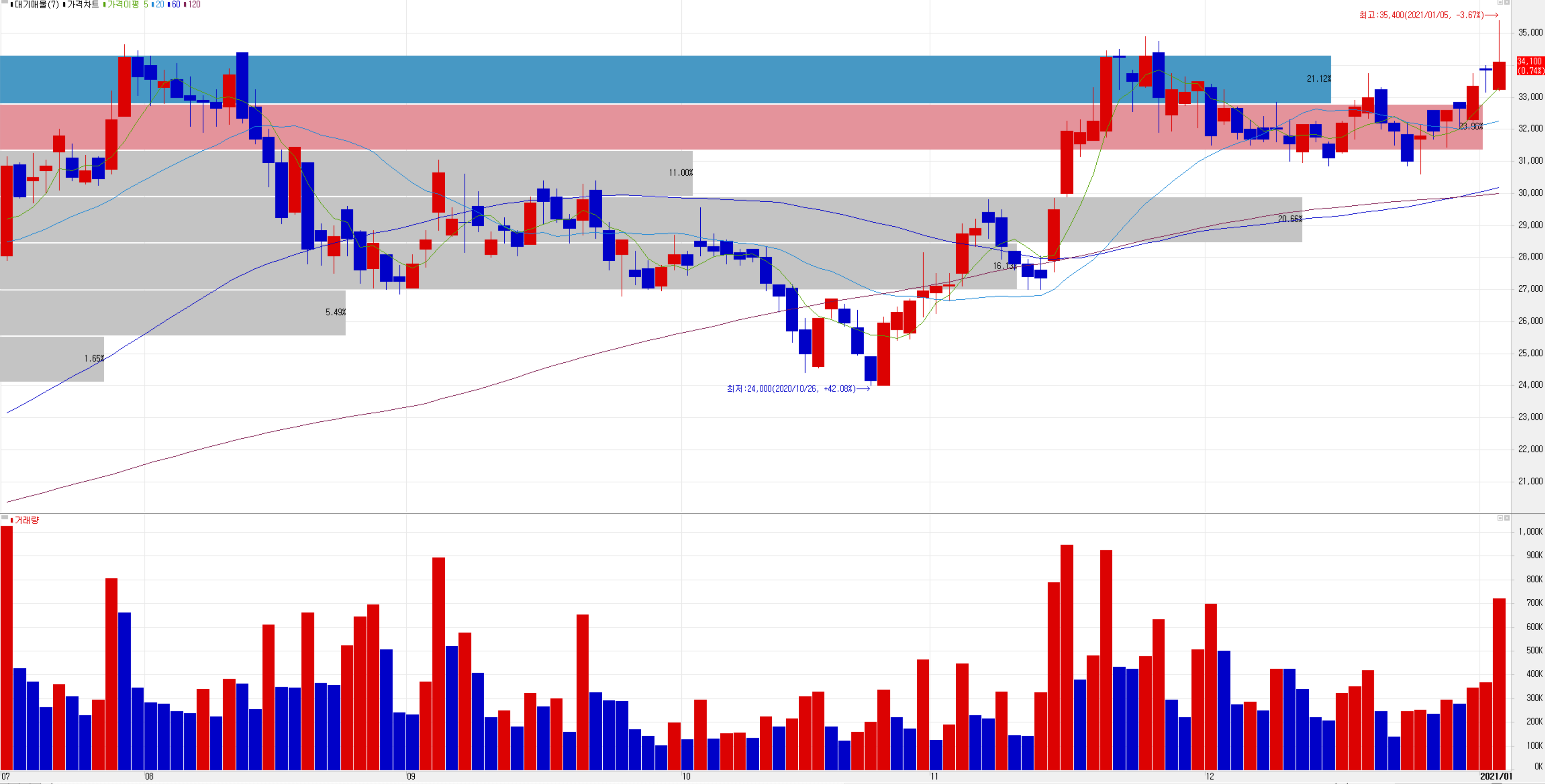 기업 분석을 정리하는 오늘 당사의 주가가 최고치를 찍고 34,100원에 마감했습니다. 33,000 부근에 대기매물이 많아서 상승을 억제하는 모습이었습니다.