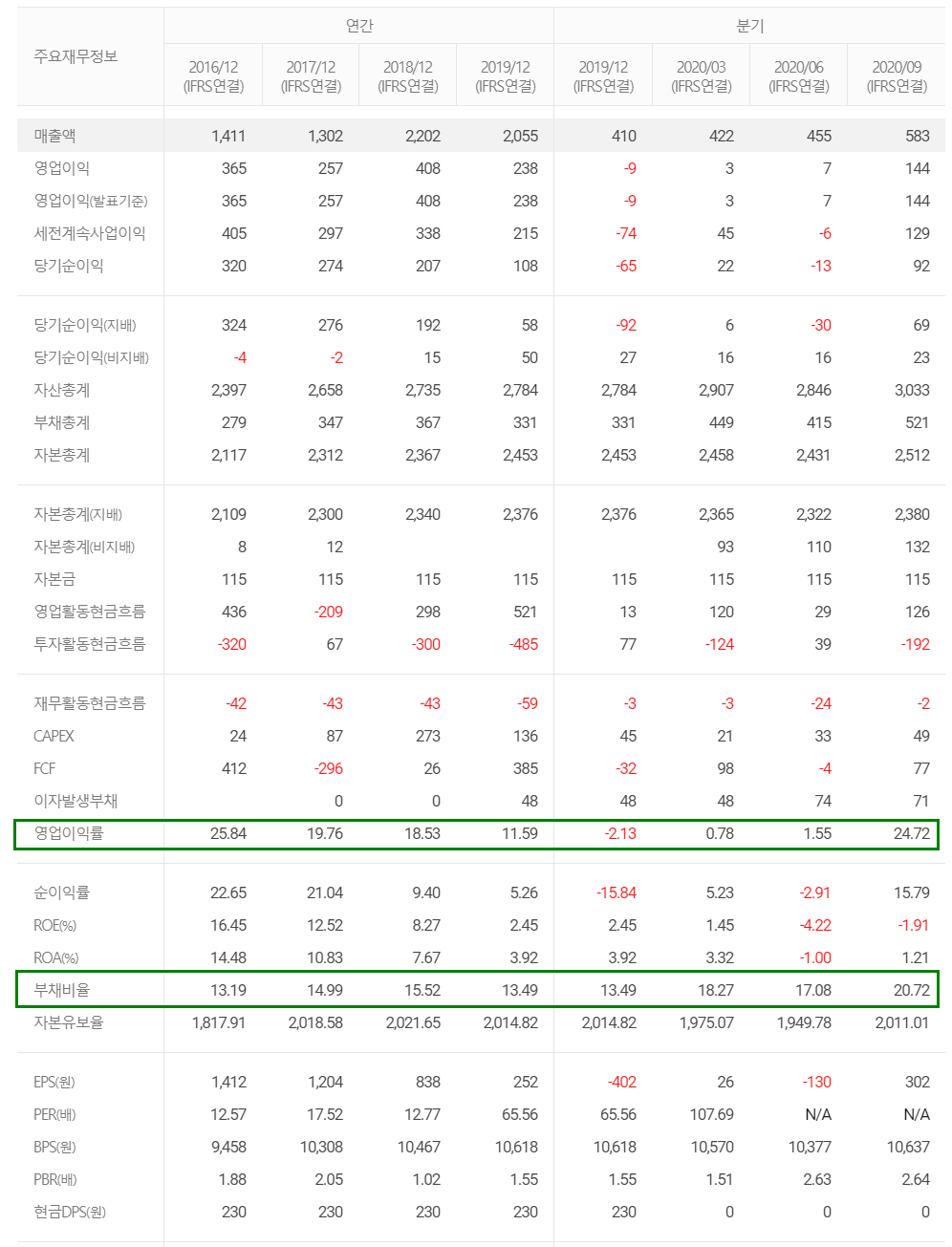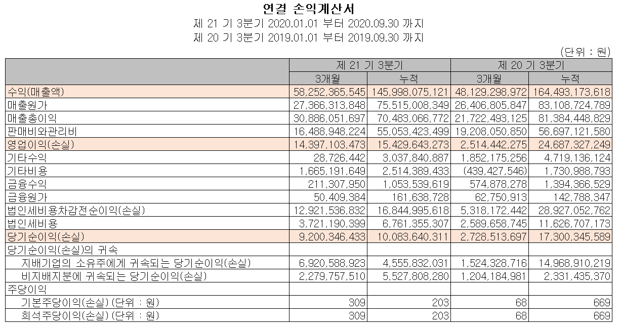 지난 2020년 3분기 실적입니다. 매출액은 582.5억 원으로 전년 동기 대비 21% 증가했고 영업이익은 144억 원으로 472% 증가했습니다.