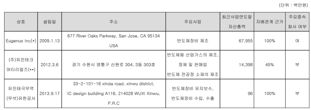 당사는 3개 종속 회사가 있으며, 미국 Aixtron Inc. 의 반도체 장비 중 ALD/CVD 증착장비 사업을 양수하면서 Eugenus Inc. 를 보유하게 되었고, 반도체 장비의 유지보수 및 수출입을 담당하는 중국 지사와, 반도체 가스 및 전공정 소재를 제조하는 (주)유진테크머티리얼즈의 지분 45%를 확보하고 있습니다.