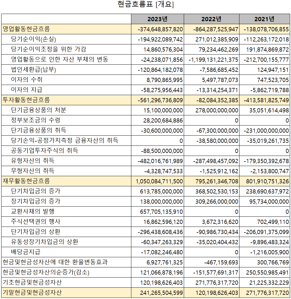 지난 2023년 영업활동 현금흐름에서는 당기순손실의 발생과 법인세, 운전 자산의 변동 등으로 3,746억 원의 유출이 발생했습니다. 투자활동에서는 유무형 자산의 취득과 금융상품의 증가, 공동기업 투자 주식의 취득 등으로 5,613억 원의 현금이 유출되었습니다. 재무활동에서는 당기 부채를 상환하고 배당금을 지급하면서 유출이 발생했으나 장단기 차입금의 증가와 교환사채의 발행을 통해 1조 501억 원의 현금이 유입되었습니다. 한편 2023년 기말 당사가 확보하고 있는 현금은 2,413억 원으로 전년 동기 대비 100.7% 증가했습니다.