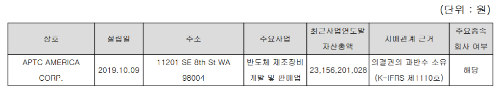 당사는 현재 미국 워싱턴에 APTC AMERICA CORP. 라는 상호의 종속법인이 있으며, 반도체 제조장비의 개발 및 판매를 영위하고 있습니다.