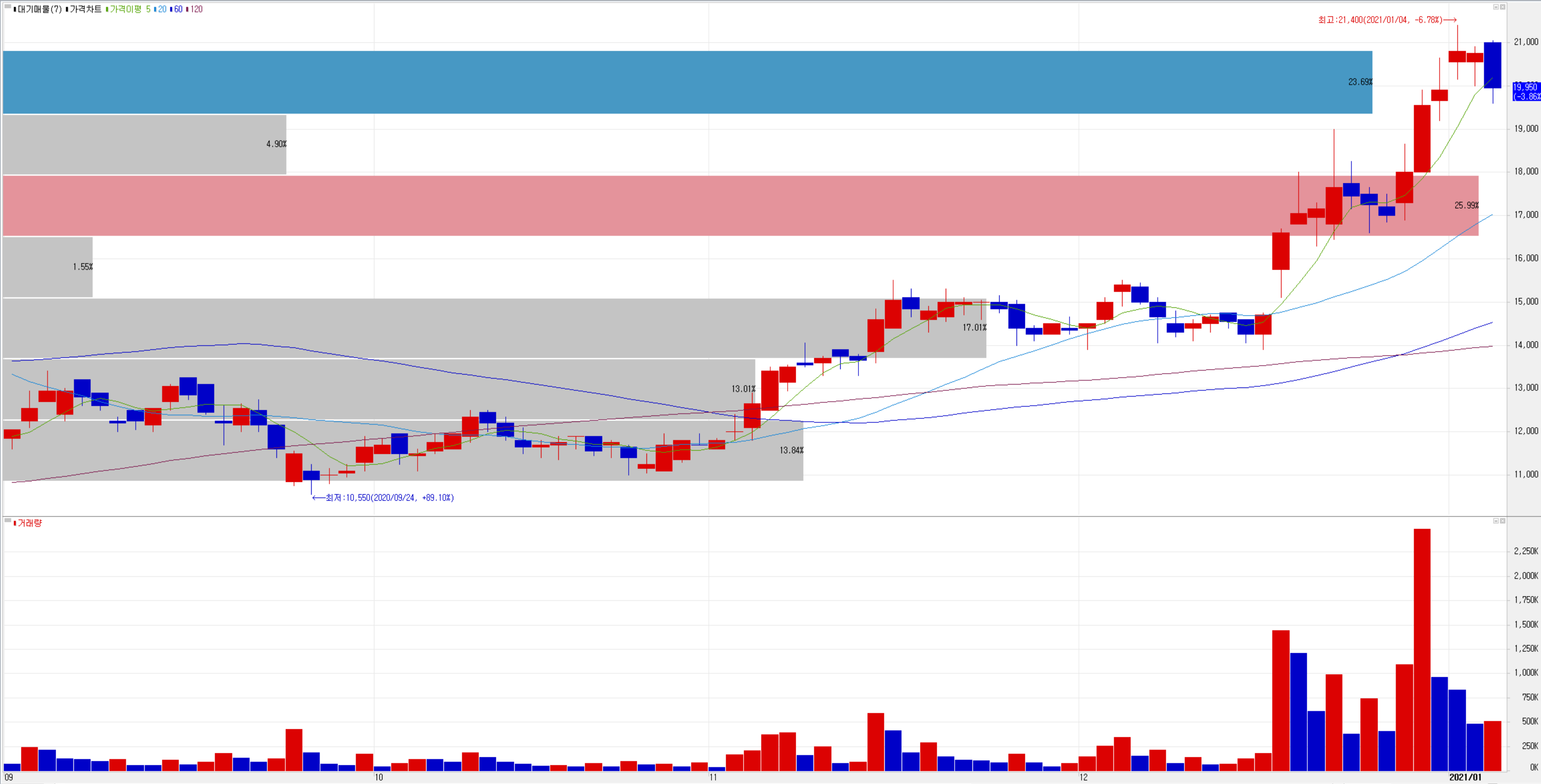 2021년 새해 첫 거래일인 1월 4일 21,100원으로 보기 좋게 최고치를 기록했으나 단기적으로 저항을 받는 모습입니다. 개인적 소견으로는 아래로 18000원까지 조정을 감안하고 봐야 할 것 같습니다. 다만, 플라즈마 소스를 적용한 차세대 식각 장비의 장점을 감안한다면 2021년 전망이 밝아 보이는 종목입니다.