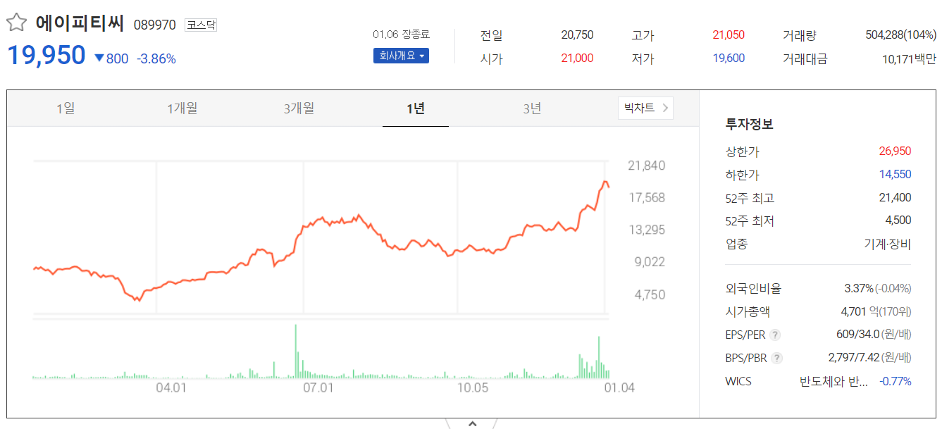 1월 6일은 전반적으로 반도체 관련 종목들이 조정을 받은 날입니다. 에이피티씨도 3.86% 내리면서 19,950원에 마감했습니다. 외국인 비율은 3.37%로 기타 반도체 장비 업종에 비해 낮은 편입니다.