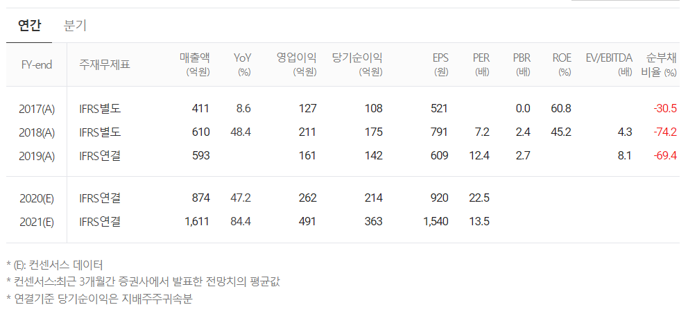 2021년에는 연 매출 1611억 원을 추정하며 전년 대비 84% 성장할 것으로 내다봤습니다.