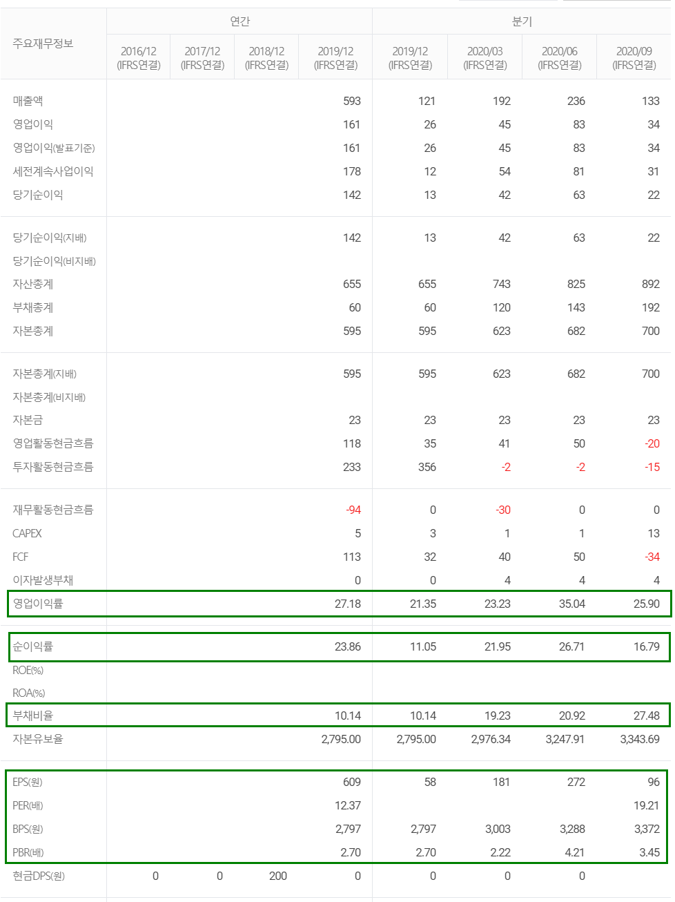 부채 비율도 문제없고, 매출액은 유사 업종 대비 작지만 영업이익률/순이익률이 월등한 기업입니다.