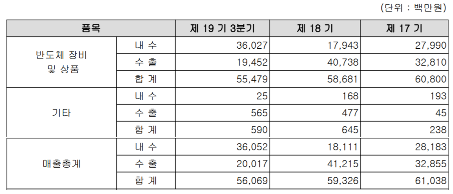 당사는 반도체 제조용 장비 전문 업체로써 장비 매출이 99% 가깝게 차지합니다.