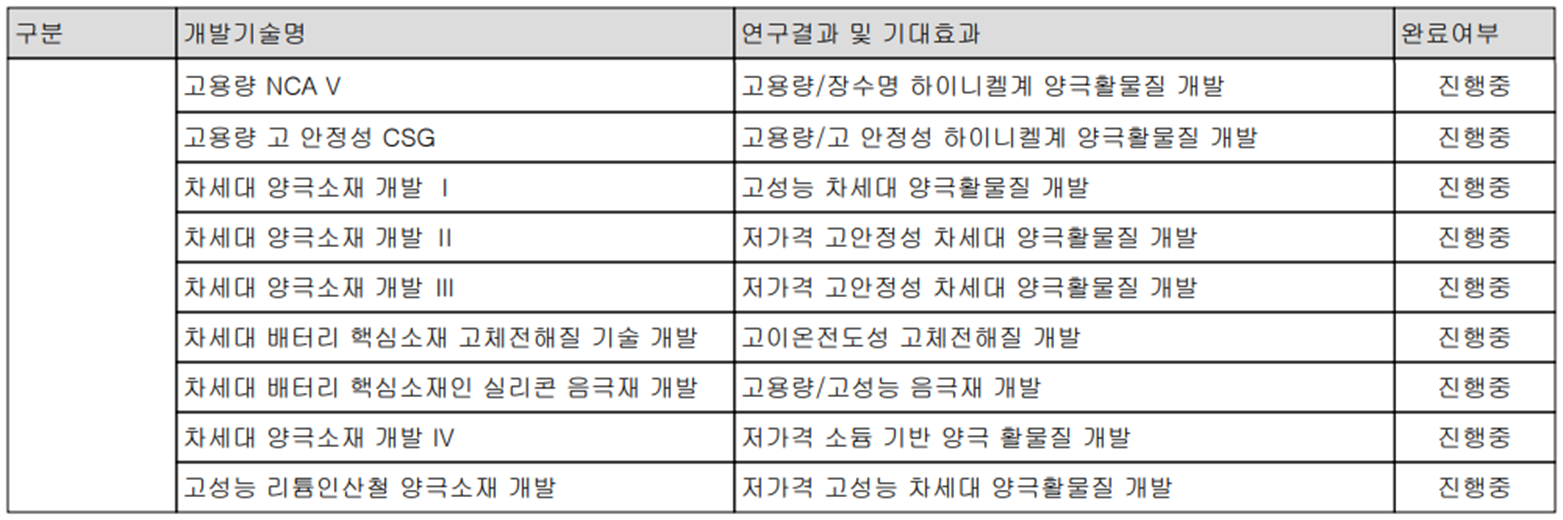 당사는 지난 1분기 매출액의 1.22%인 118억 원을 투입하면서 차세대 양극재 및 고성능 LFP(리튬인산철) 양극소재의 연구 개발을 수행하고 있습니다.