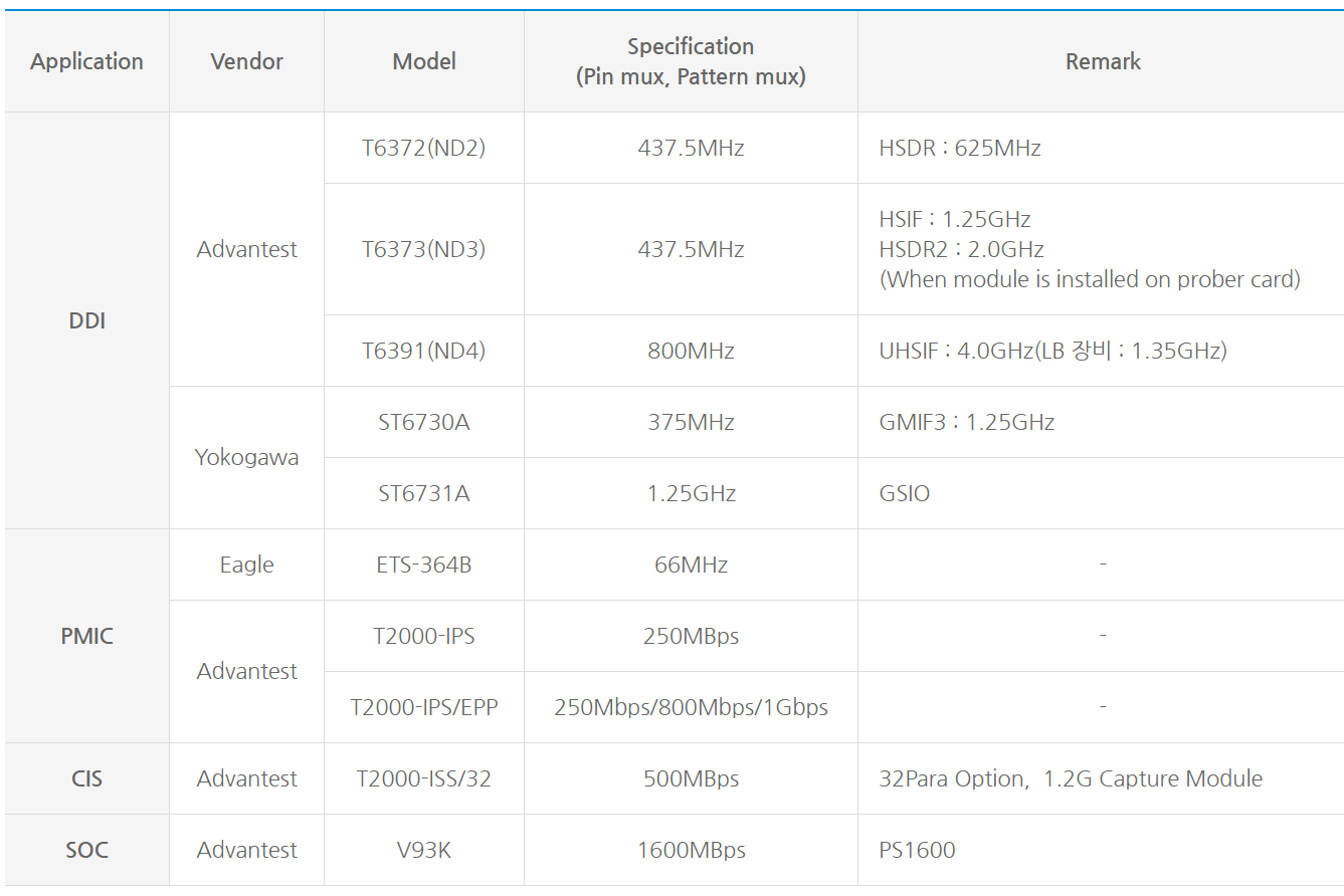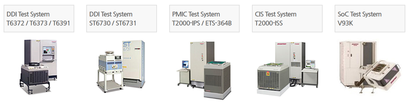 당사의 웨이퍼 테스트 시스템에은 DDI(Display Driver IC), PMIC(Power Management IC), CIS(Cmos Image Sensor), SoC(System on Chip) 등에 대응할 수 있는 완벽한 설비를 갖추고 있습니다.