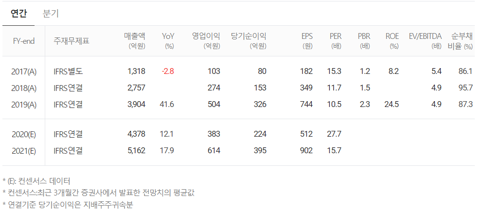 컨센서스 데이터는 현재 2020년 매출은 4378억 원으로 전년 대비 12.1% 증가하고, 영업이익은 383억 원으로 감소하는 것으로 추정했습니다. 2021년은 매출액 5162억 원으로 2020년 대비 17.9% 증가하며, 영업이익은 614억 원으로 전년 대비 60% 증가할 것으로 내다봤습니다.