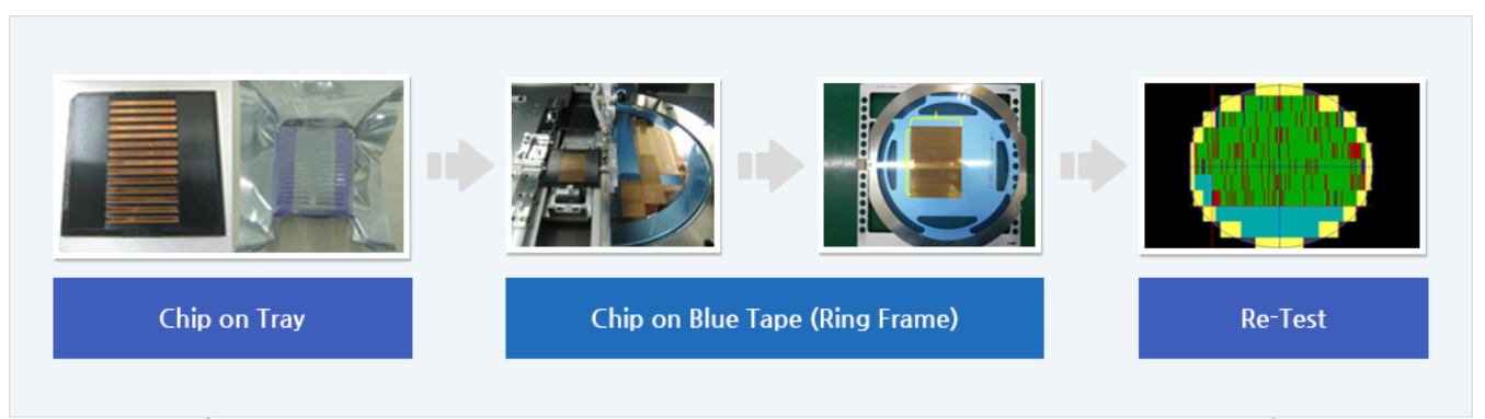 Wafer test 가 끝난 후 Sawing 처리된 칩에 대해 Sorting Issue 나 디버깅(debugging) 테스트가 필요할 경우 칩의 손실을 최소화하여 웨이퍼 레벨 칩 테스트를 실시하는 공정입니다.