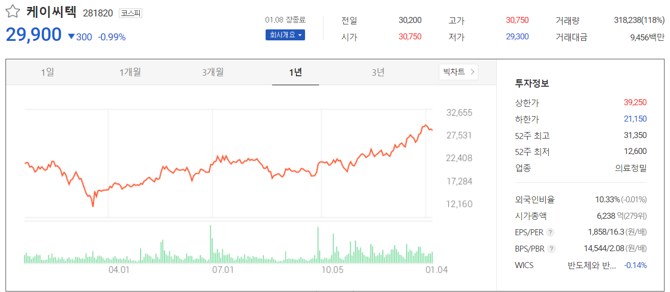 케이씨텍의 외국인 보유 비율은 10.33%로 중소형 주 치고는 낮지 않습니다. 시가총액 6238억 원으로 코스닥 시총 순위 279위입니다.