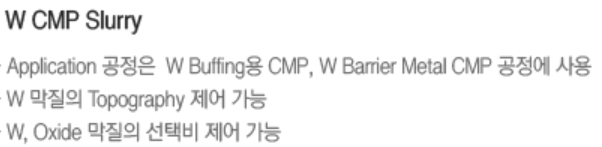 CMP 공정에 사용되는 세리아 슬러리는 희토류인 세리아 100-500nm 입자에 첨가제를 혼합한 제품으로써, 연마 대상 막을 화학적, 기계적으로 나노미터 단위로 제거하는 역할을 하는 연마제입니다.