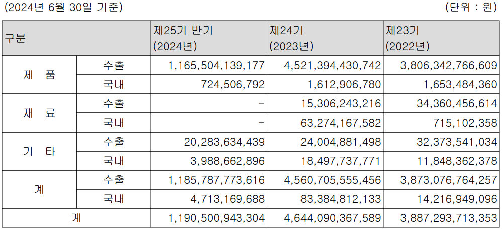 당사는 국내 기업으로는 최초로 안전성이 뛰어나고 저렴한 니켈 복합계열(NCM)의 양산기술 개발에 성공하면서 기존 양극재인 LCO를 대체시키면서 2차 전지 산업의 변화를 선도하는 기업입니다. 당사의 사업은 양극활물질 단일 사업으로 구성되어 있으며, 고객사의 요구에 따라 제품 및 재료의 상태로 공급하게 됩니다. 지난 상반기 중에는 수출이 1조 1,858억 원으로 전체 매출액의 99.6%를 차지하였습니다.