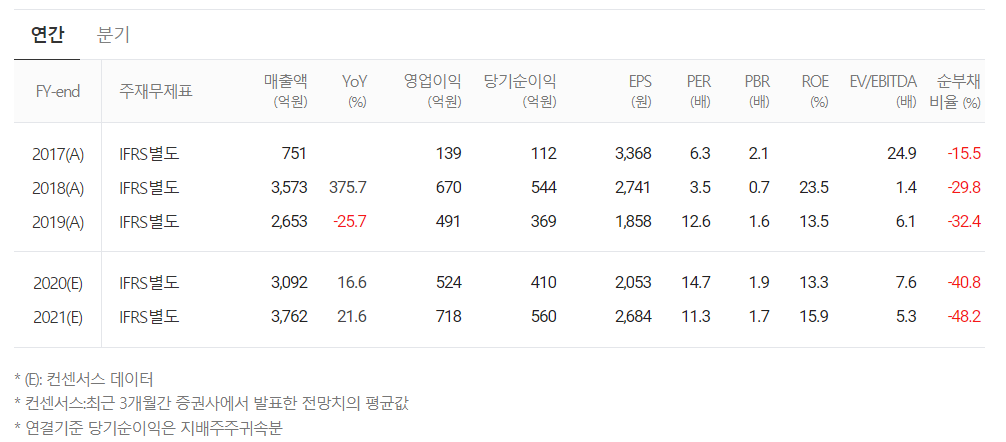 컨센서스 데이터에 의하면 당사의 2020년 4분기 실적은 1000억 원을 돌파할 것으로 예측하면서 연매출 3,092억 원으로 추정했습니다. 2021년 매출액은 3762억 원으로 전년 대비 21.7% 증가하는 것으로 전망하고 있습니다.