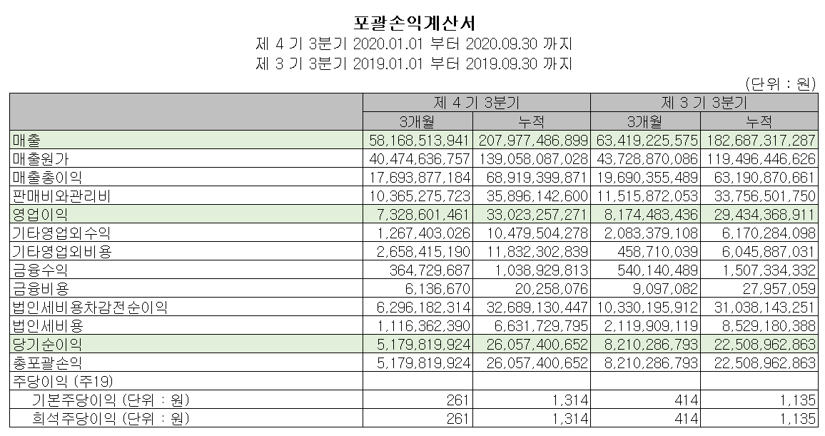 2020년 3분기 누적 매출액은 2079.7억 원으로 전년 동기 대비 13.8% 증가했고, 영업이익은 330억 원을 기록하며 12.2% 증가했습니다.