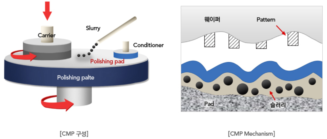 칩 각각의 높이가 다른 부분이 Pad와 접촉하면 서로 다른 압력을 받아서 상대적을 높은 부분이 연마됨으로써 평탄화를 구현합니다. 그림에서 Polishing Plate와 Carrier를 상대 운동시켜서 웨이퍼 표면의 패턴을 평탄화 시킵니다. 화학적 연마는 웨이퍼 표면에 발생한 스크래치 등 기계적 연마로 해결하기 어려운 부분에 슬러리를 넣은 다음 연마하여 평탄화를 구현합니다.