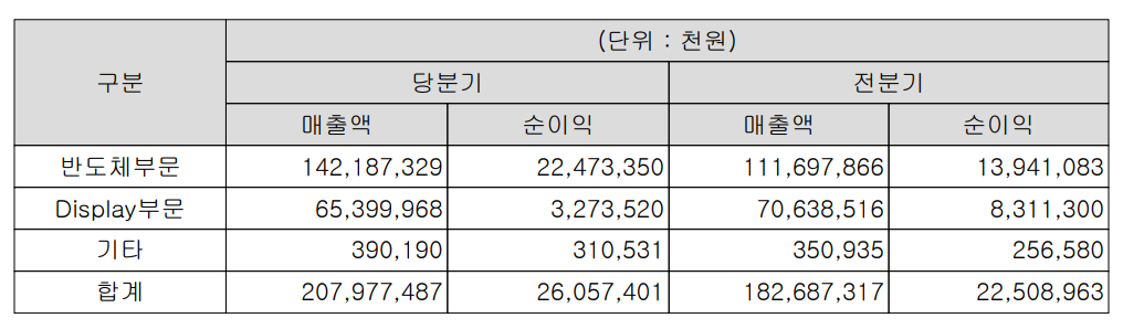 지난 2020년 3분기의 경우 반도체 부문이 142억 원으로 전체 매출의 68.4%를 차지하였고, 디스플레이 31.4%, 기타 매출이 0.2%입니다.