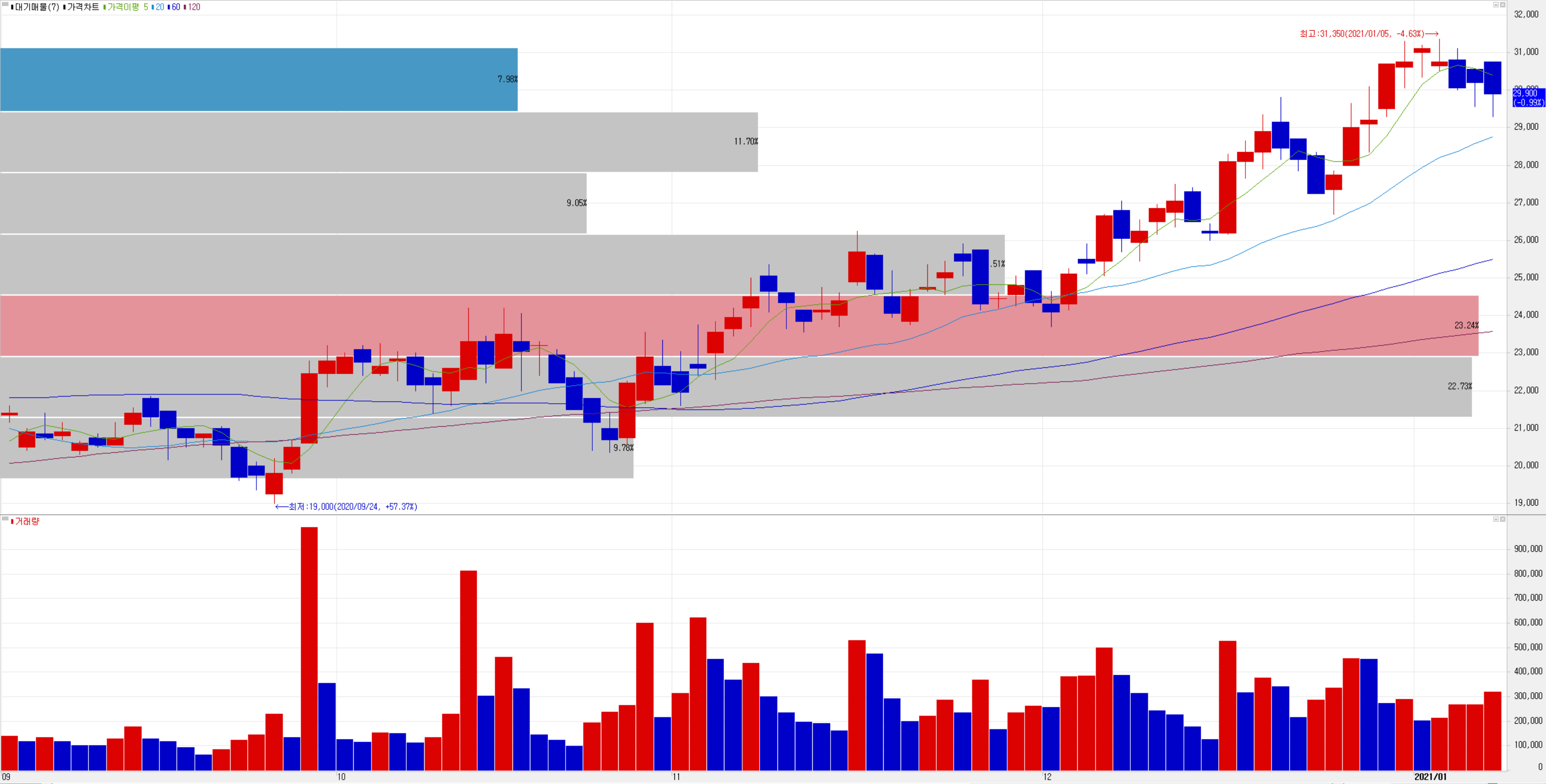 차트는 요즘 큰 이슈가 없는 한 여타 잘 나가는 반도체 장비 종목들과 유사한 추이를 보이고 있습니다.