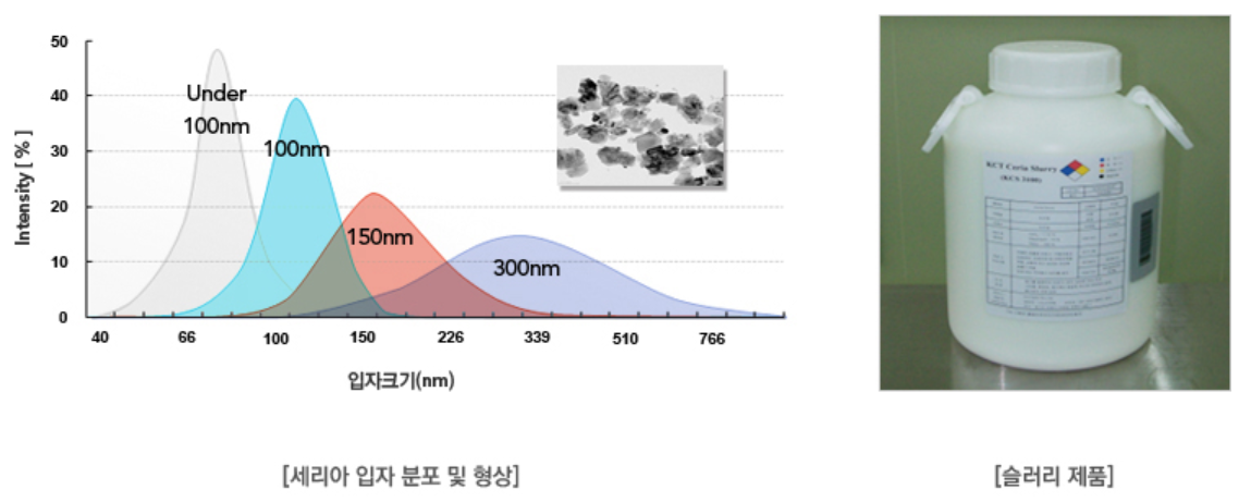CMP 공정에 사용되는 세리아 슬러리는 희토류인 세리아 100-500nm 입자에 첨가제를 혼합한 제품으로써, 연마 대상 막을 화학적, 기계적으로 나노미터 단위로 제거하는 역할을 하는 연마제입니다.