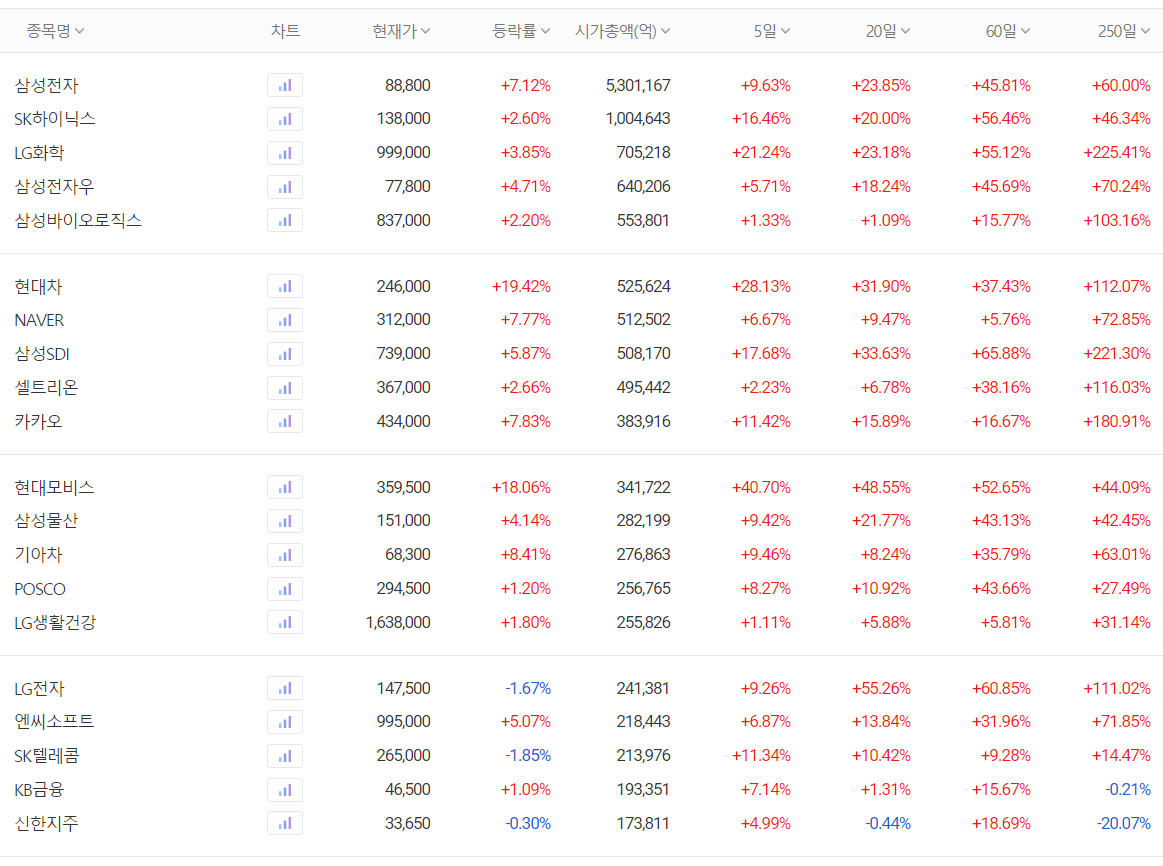 코스피가 연일 사상최고치를 기록하면서 대형주가 마치 중소형 주 급등하듯이 올랐는데요, 특히 정유와 2차전지 2개 분야에 호재를 만난 SK이노베이션의 주가가 5 거래일 동안 48.95%나 상승했습니다. SK이노베이션의 2021년 불확실성은 다음 달 10일에 있을 LG화학과의 소송건인데요, 국내외 정치권에서도 잘 마무리되도록 노력 중인 듯하니 어서 마무리하고 글로벌 2차전지 시장에서 우리 기업들이 꽃길만 걸었으면 좋겠습니다.
