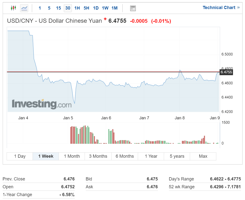 지난 주 중에 중국 인민은행이 위안화 중간 환율을 지난 2005년 이후 최대폭으로 내려 고시하면서 한때 1달러당 6.42위안 대까지 하락했으나 현재 6.4755 위안을 기록 중입니다.