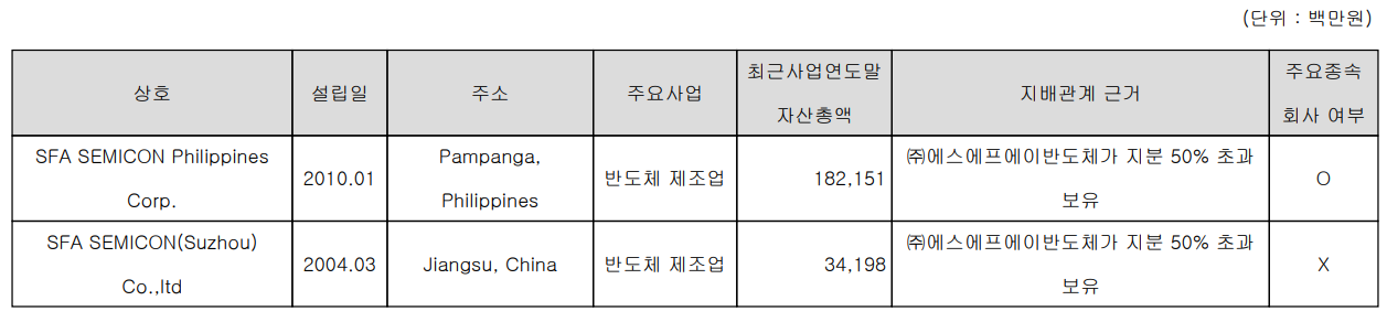 종속회사로는 필리핀과 중국에 각각 1개 종속회사가 있으며, 반도체 제조업을 목적으로 설립되었습니다.