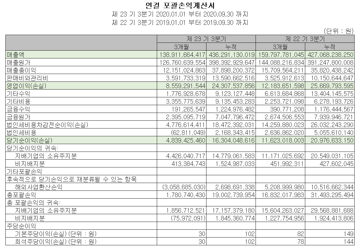 당사의 2202년 3분기 매출은 누적기준 4362.9억 원으로 전년 동기 대비 2.2% 증가하였으나 영업이익은 243억 원을 기록하면서 5.3% 감소했습니다. 고객사의 시스템반도체 육성 전략에 따른 S-LSI 등 패키징 설비 증설로 인한 투자가 있었습니다.