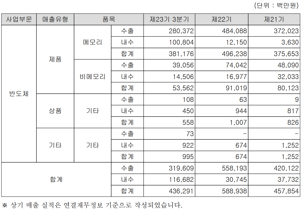 각 부문별 매출 상황은 2020년 3분기의 경우 메모리 부문이 64.3%, 비메모리 부문이 23.1%를 차지하였습니다. 당사는 OSAT 업체로써 반도체 후공정 서비스를 제공하는 기업이기 때문에 특정 제품별 매출 집계가 아닌 부문별 매출 집계를 하게 됩니다.