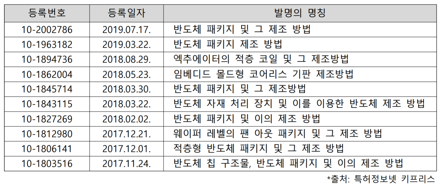 아래 표는 당사의 주요 패키징 기술 관련 특허입니다.